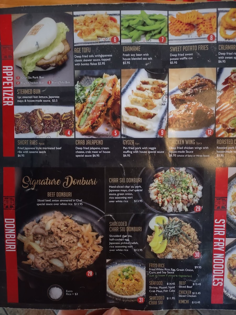 Start your meal with unique appetizers like the Char Siu Pork Bun and Fried Chicken Bun, each enhanced with house-made sauces for a burst of flavor, all priced at just $3.50. For a heartier option, try the Short Ribs, deep-fried Japanese style.